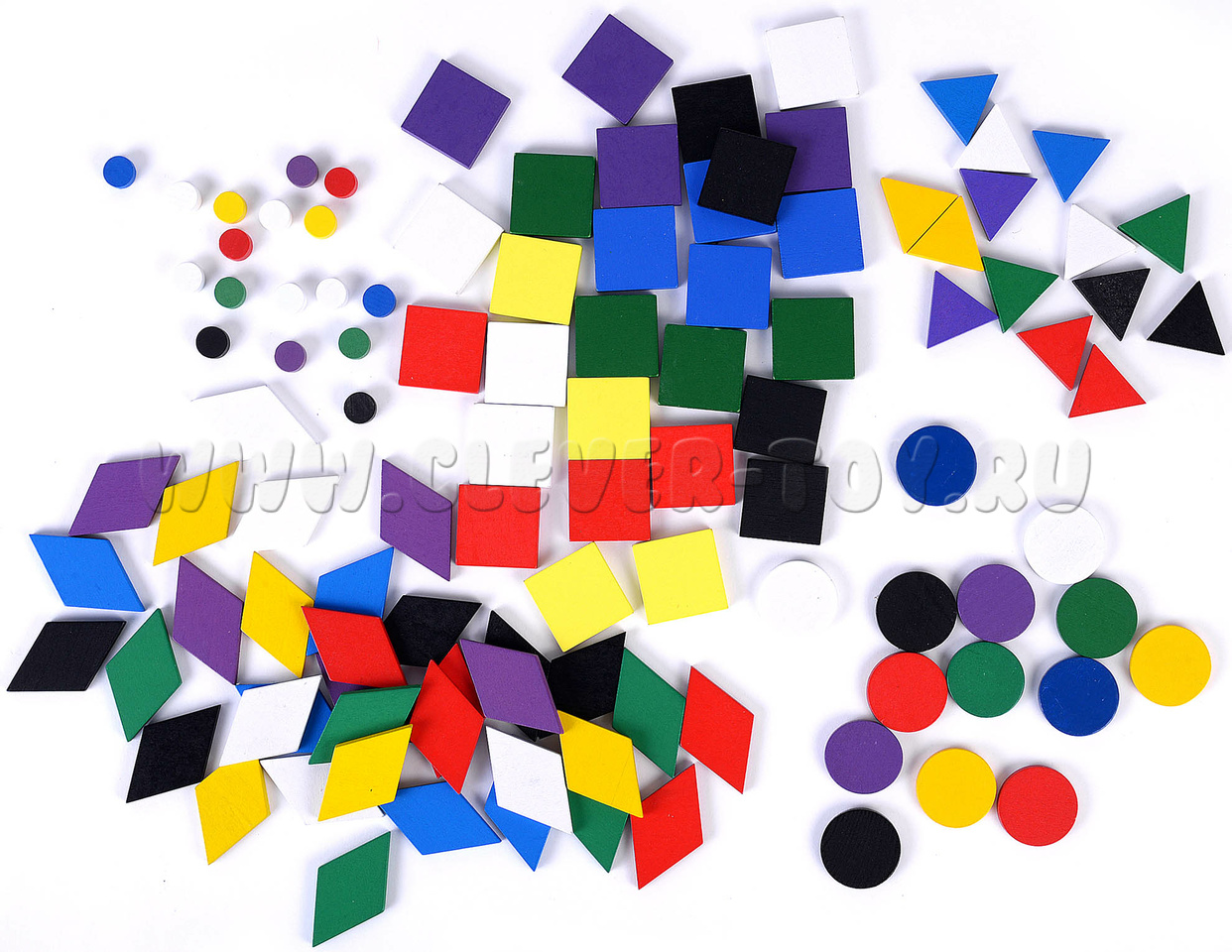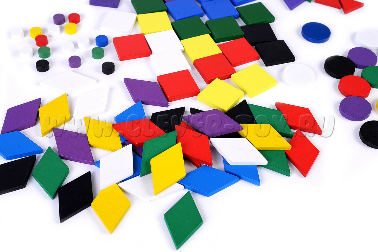 3. Геометрические фигуры разных цветов: круги (14 штук), квадраты (28 штук), ромбы (35 штук), треугольники равносторонние (14 штук), точки (17 штук);