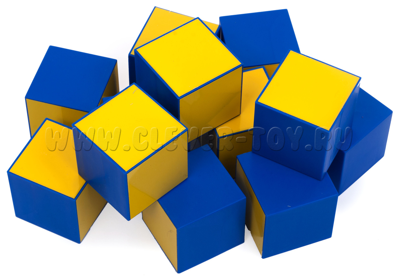 • 12 кубиков. Все кубики одинаковы по размеру, у каждого 3 грани, сходящиеся в одной вершине, окрашены одним цветом, а 3 следующие грани – другим цветом.