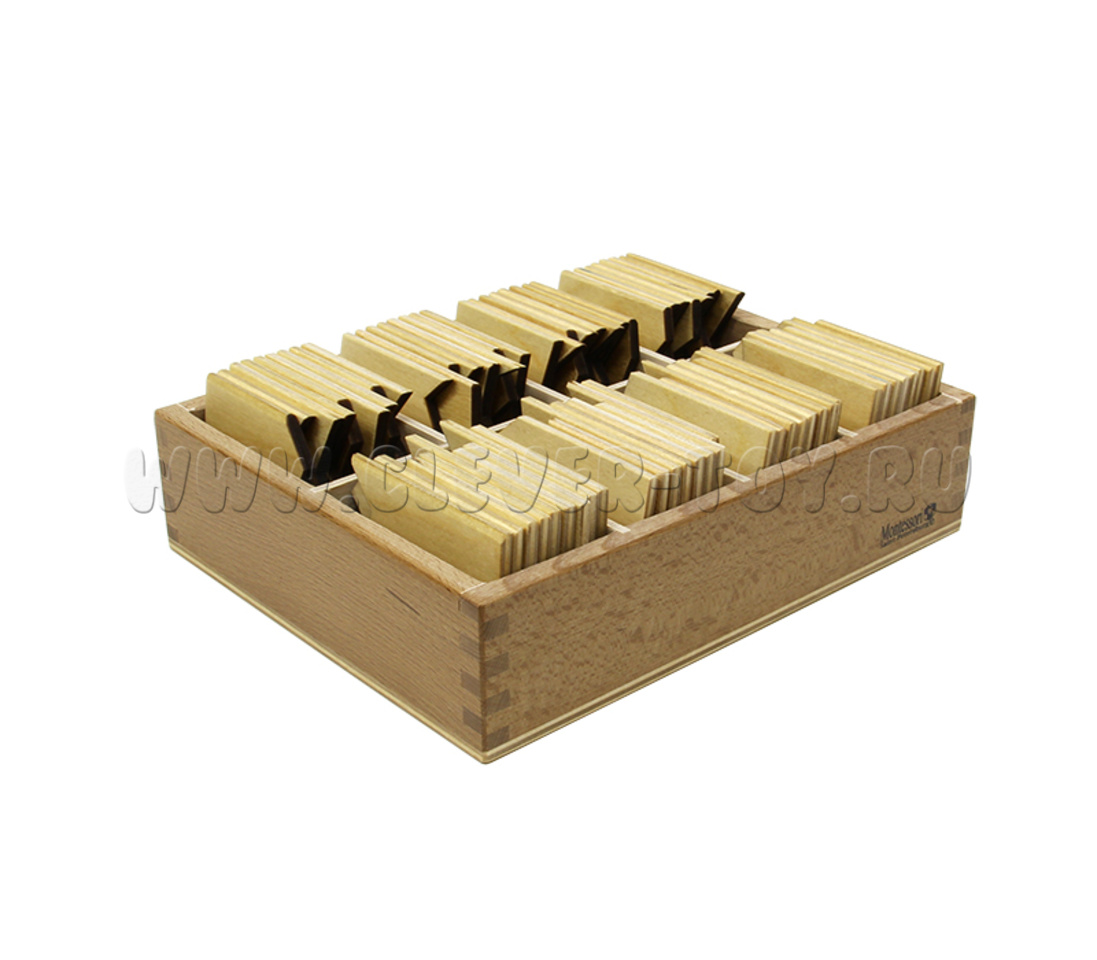 В комплект входят деревянная коробка и 66 табличек-пазлов с письменными и печатными буквами.