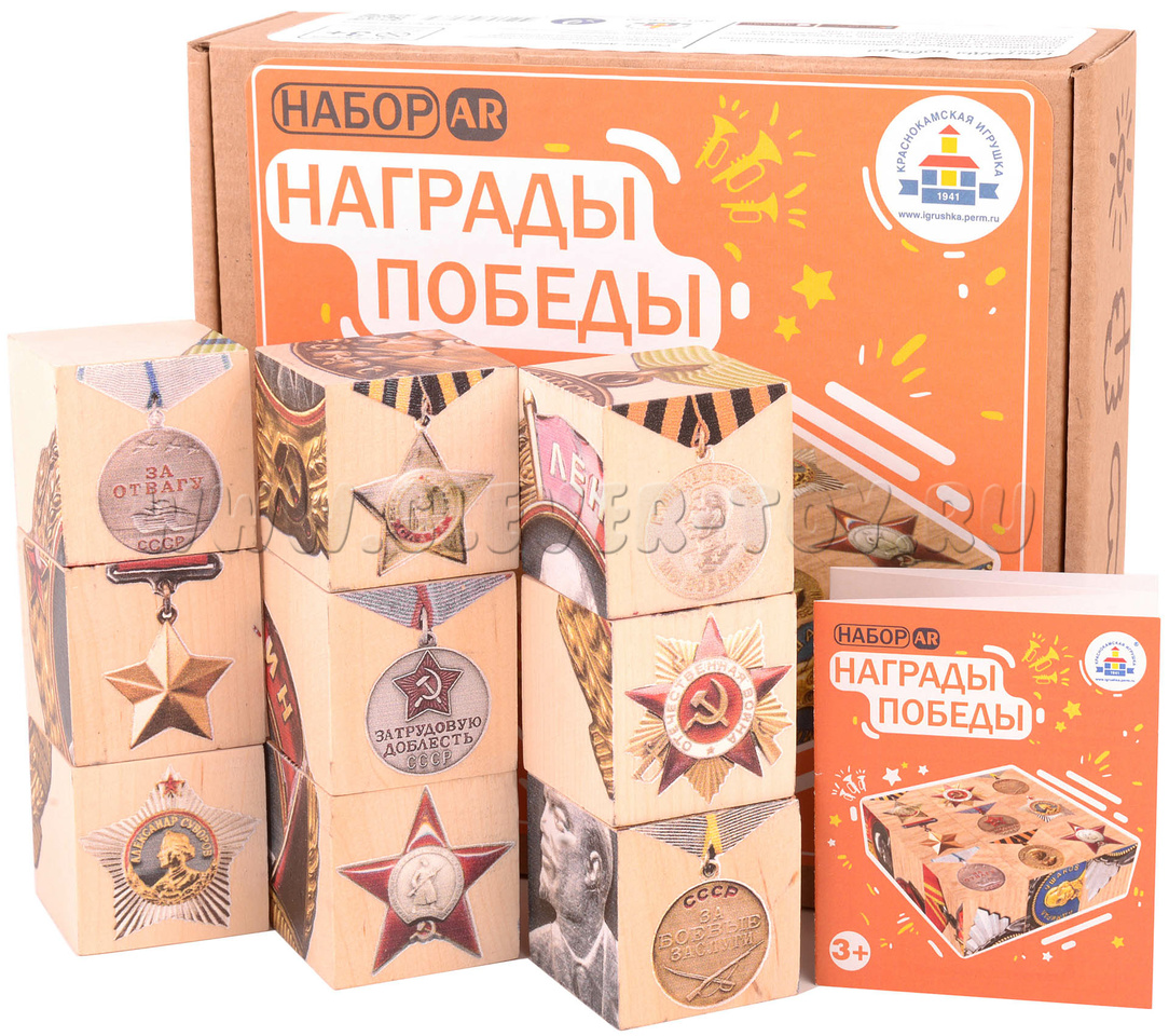 Набор интерактивных деревянных кубиков «Награды Победы» созданы к 75-летию победы в Великой Отечественной Войне. На них изображены ордена и медали, которые в годы войны изготавливались на Краснокамском Гознаке.