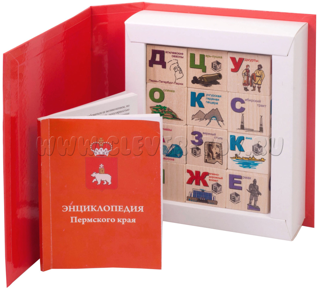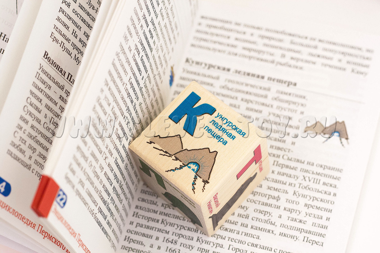 Набор «Энциклопедия Пермского края» состоит из 12 деревянных кубиков, на каждой грани которого нанесены буквы русского алфавита и картинка, изображающая символы истории, природы и культуры Пермского края: