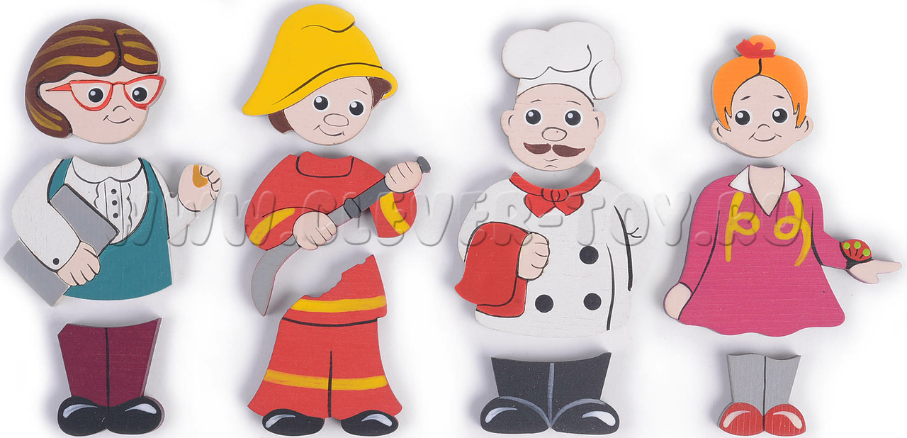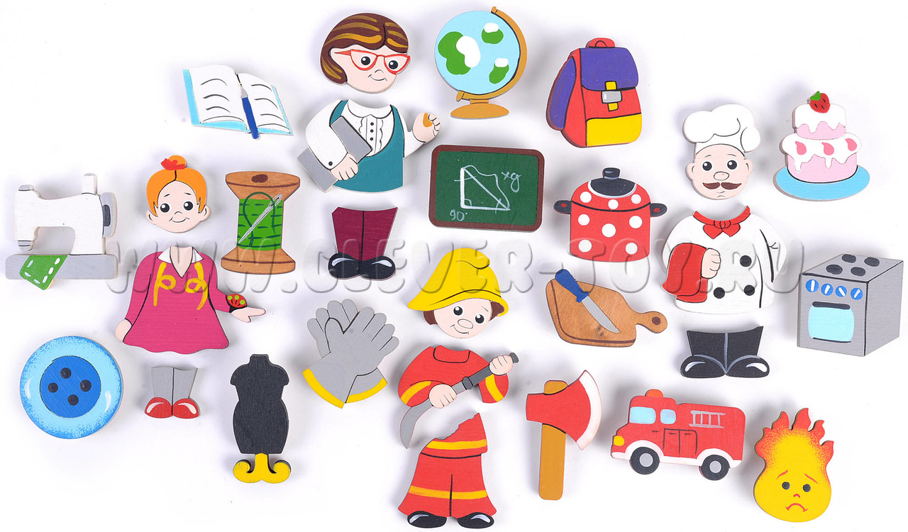 • Фигурки людей 4-х профессий (вкладываются в рамку, составные):Пожарный, Учитель, Швея, повар;