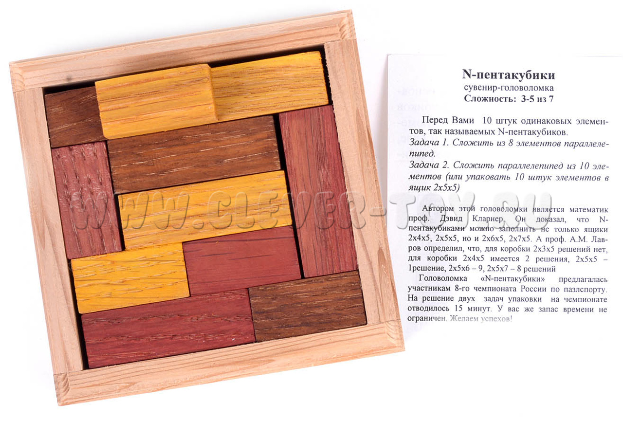 Автором этой головоломки является профессор Дэвид Кларнер, математик и популяризатор головоломок. Профессор доказал, что N-пентакубиками можно заполнить не только ящики 2х4х5, 2х5х5, но и 2х6х5, 2х7х5. А из этих ящиков можно составить и более вместительные ящики, сплошь заполненные N-пентакубиками.