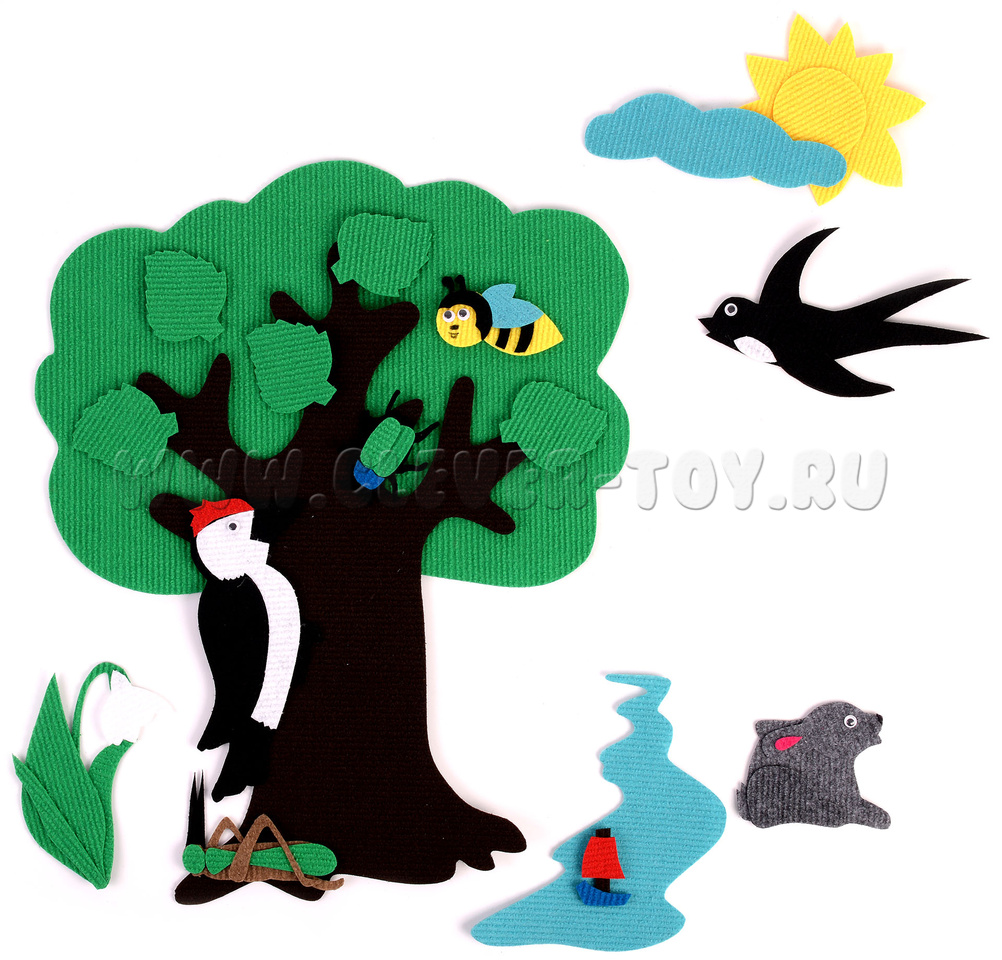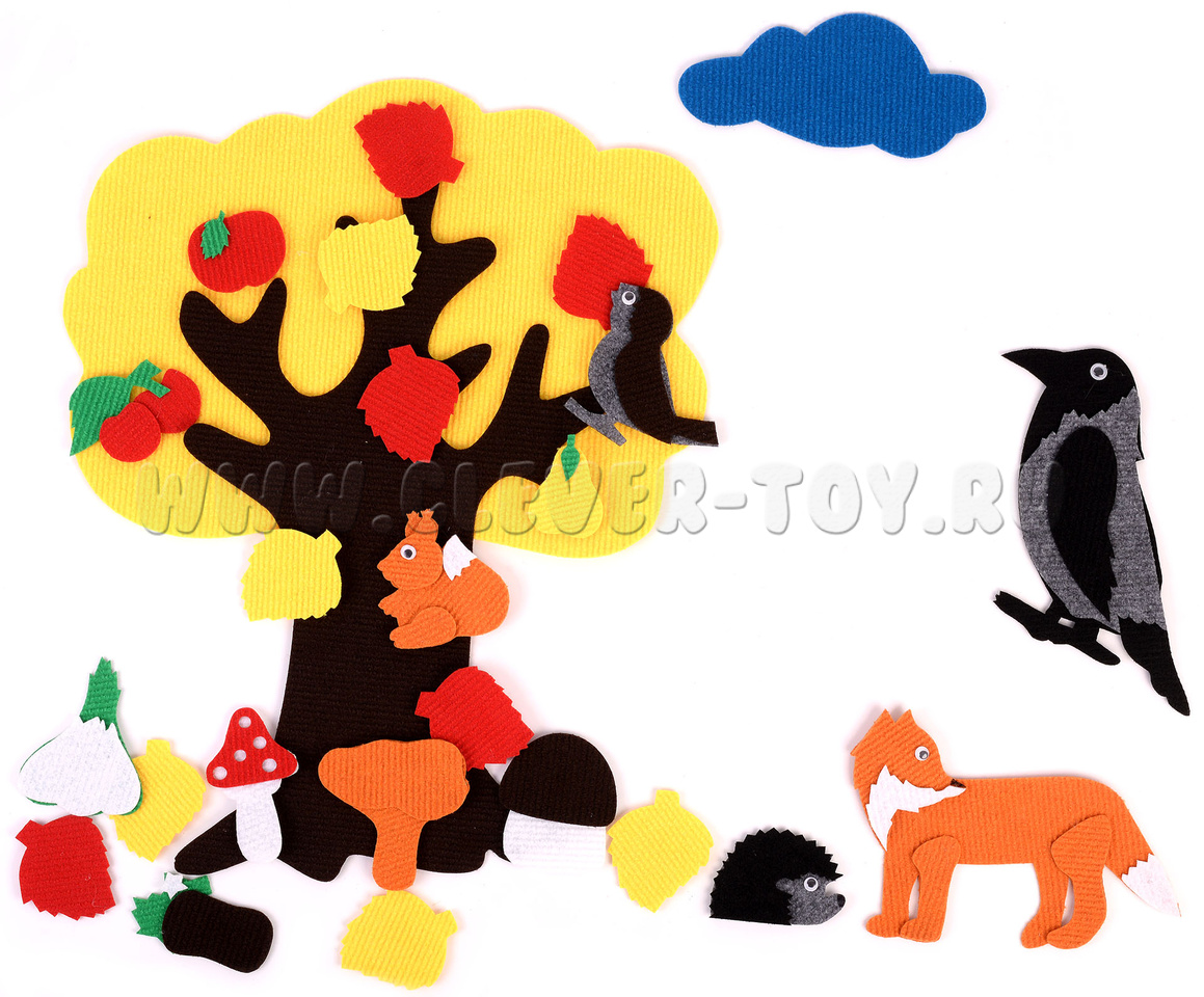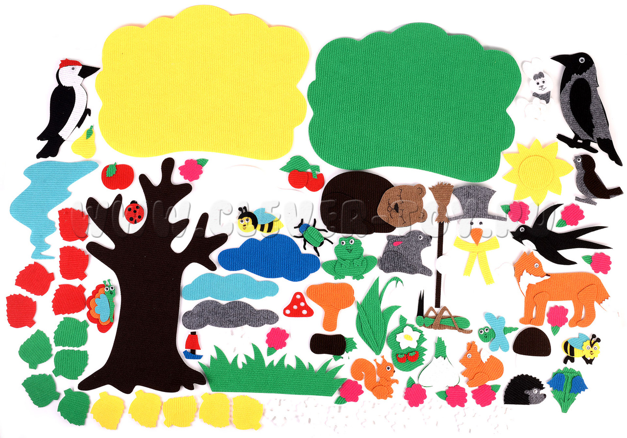 - растения – груша, яблоко, клубника, шиповник, крона жёлтая, крона зелёная, ствол дерева, листочки зелёные, красные, жёлтые, цветочки – 10 шт.;