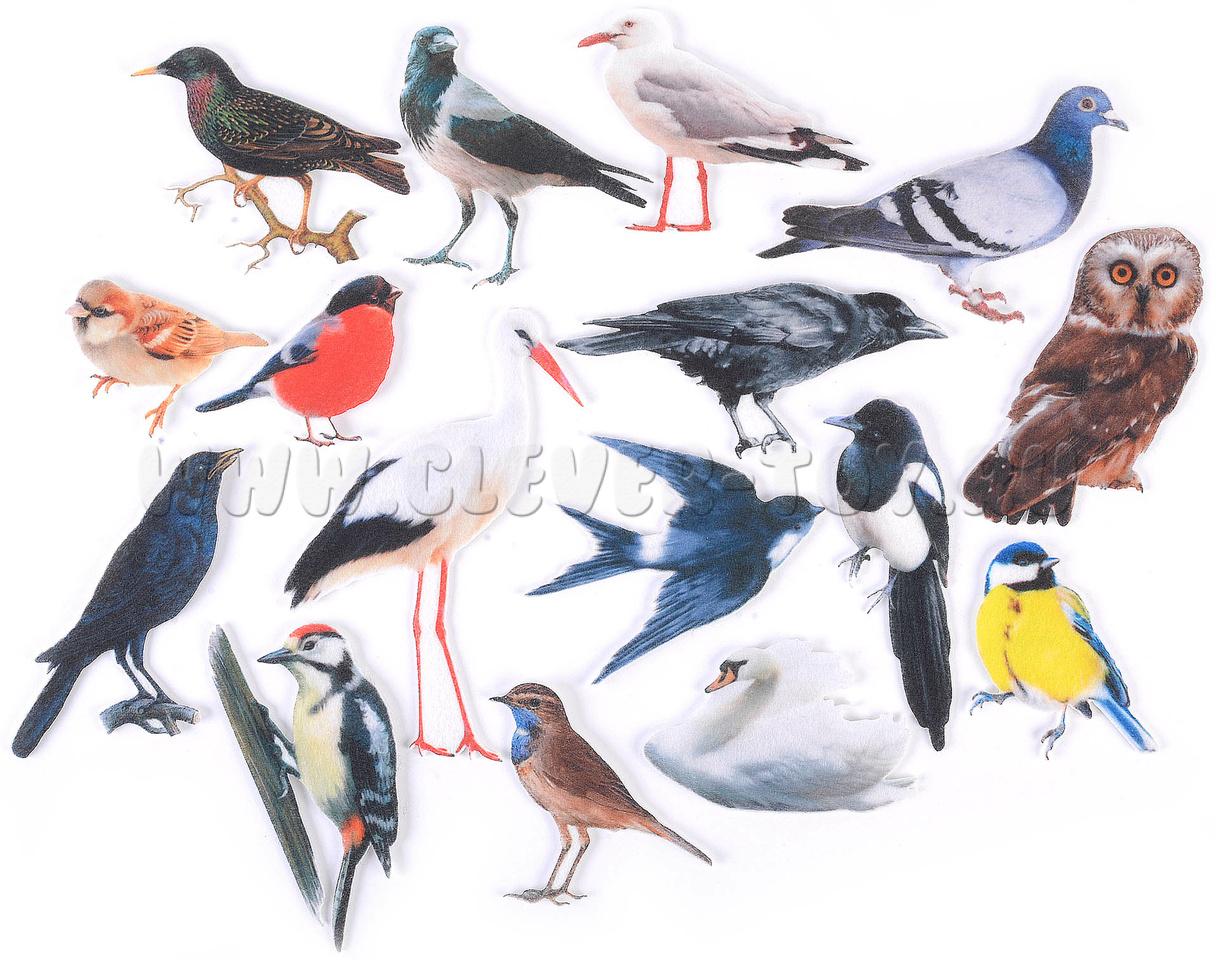 - Набор из 16 фигурок птиц на липучках (снегирь, дятел, дрозд, сова, ворона, воробей, ласточка, соловей, синица, сорока, скворец, голубь, чайка, аист, лебедь, грач)