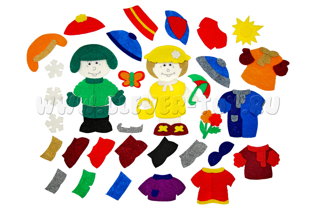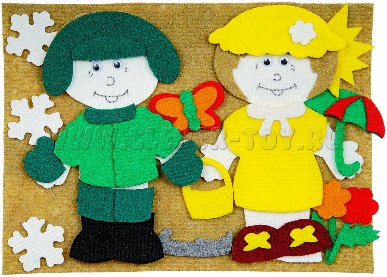 Все элемента одежды и атрибуты сезонов снабжены многоразовыми липучками, легко крепятся на игровое поле, подходят для занятий с детьми в группе и для самостоятельной игры ребёнка.