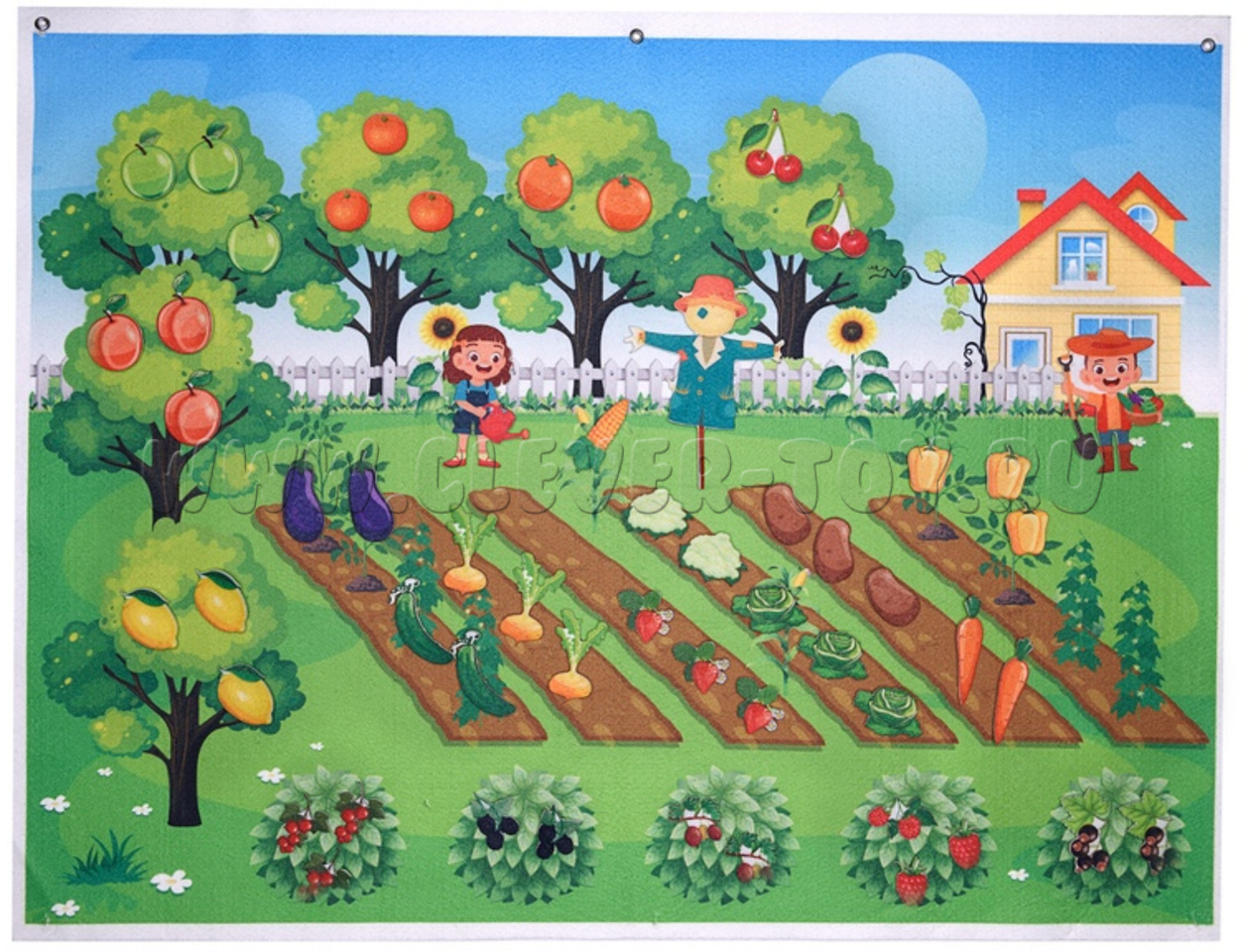 В комплект игры входит игровое поле размером 60x80 сантиметров с изображением домика, деревьев, кустов и грядок. Также в набор входят различные элементы с изображением фруктов, ягод и овощей.