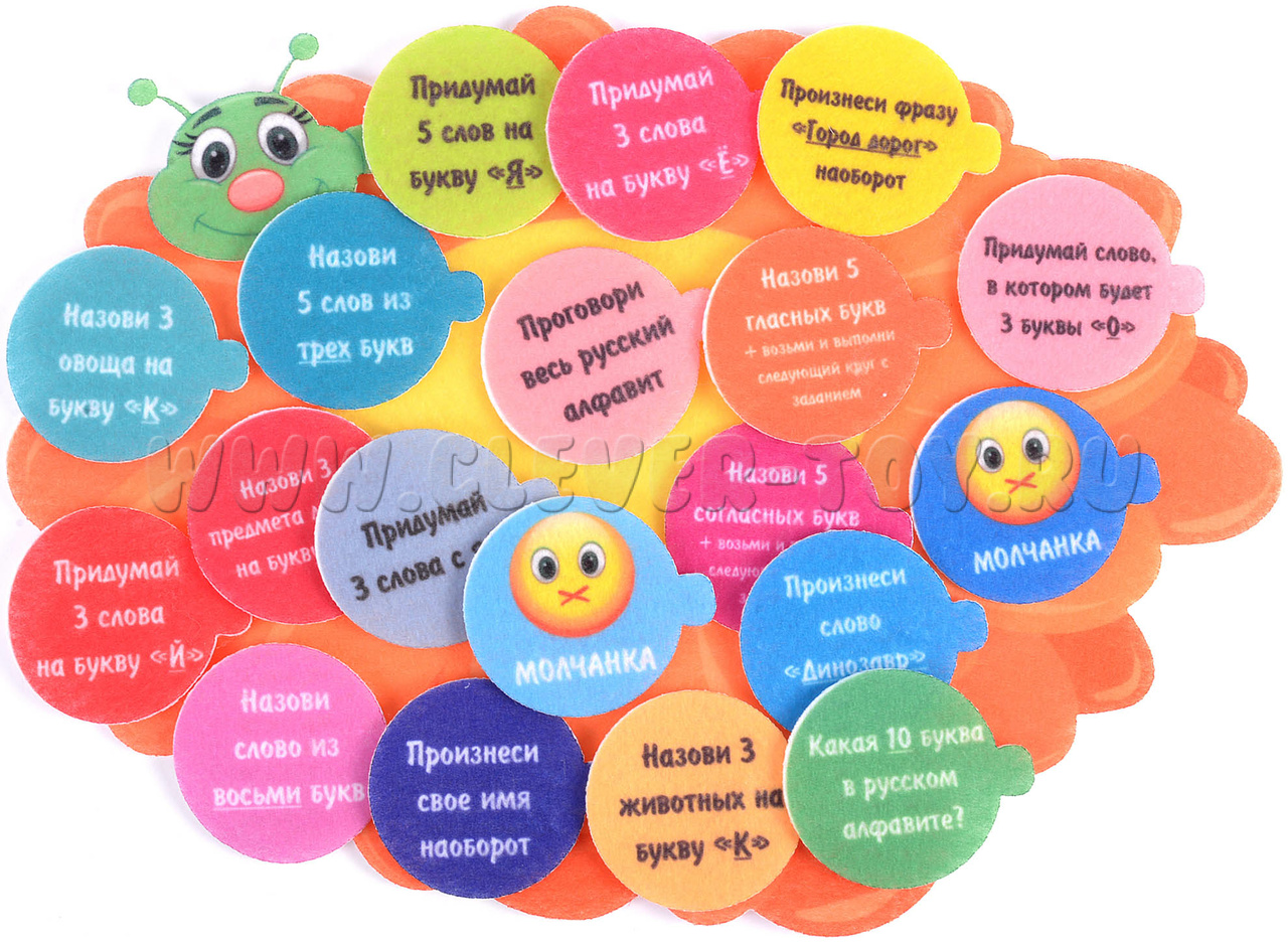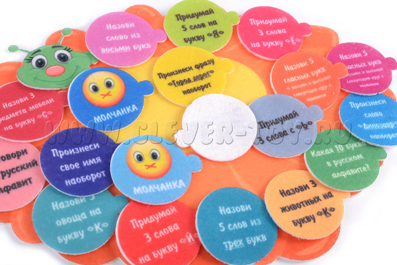В комплекте: цветок размером 27 * 20 см, кружки с заданиями диаметром 4,5 см, голова гусенички размером 3,5 * 4,5 см и фигурки на липучках.