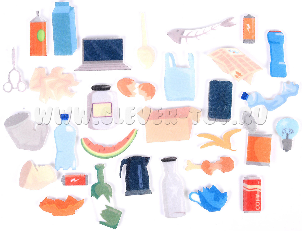 В наборе вы найдёте 31 фигурку, выполненную из мягкого и приятного на ощупь материала — фетра. Каждая фигурка представляет собой определённый вид мусора: бумага, пластик, стекло, органические отходы и т. д. Фигурки крепятся к игровому полю с помощью липучек, что позволяет детям легко и безопасно сортировать их.