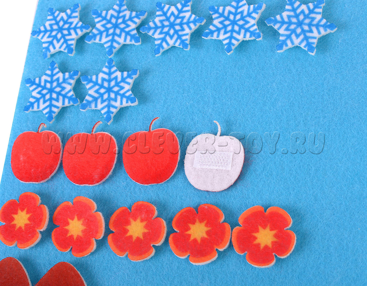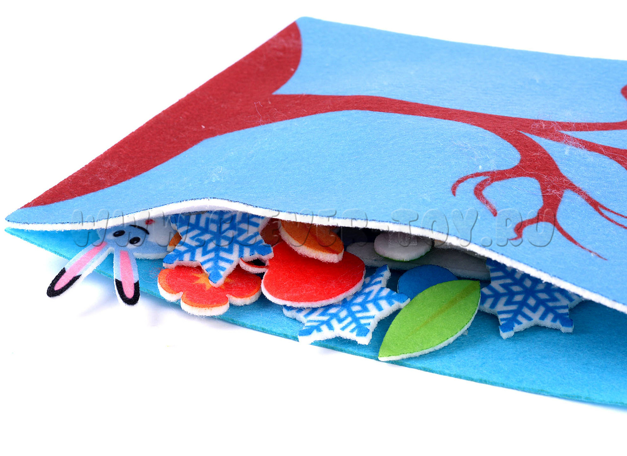Все игровые элементы аппликации выполнены из современного материала – фетра. Он обладает рядом удивительных свойств: мягкий, яркий (окрашен безопасными красками), прочный и долговечный. Детали аккуратно вырезаны на специальном станке, легко крепятся на игровое поле с помощью липучек. На игровом поле сзади имеется специальный карман для хранения фигурок, чтобы они не терялись.