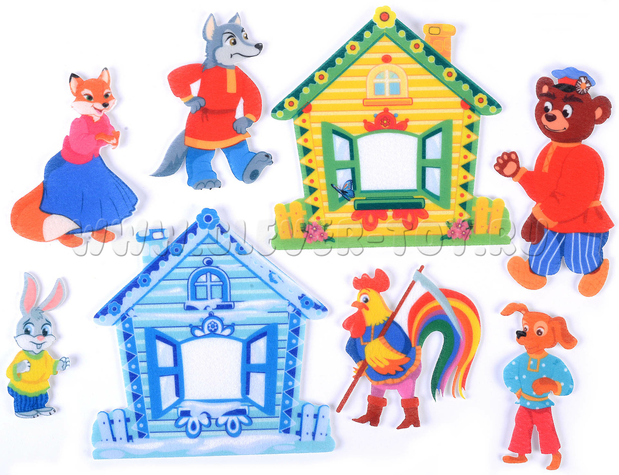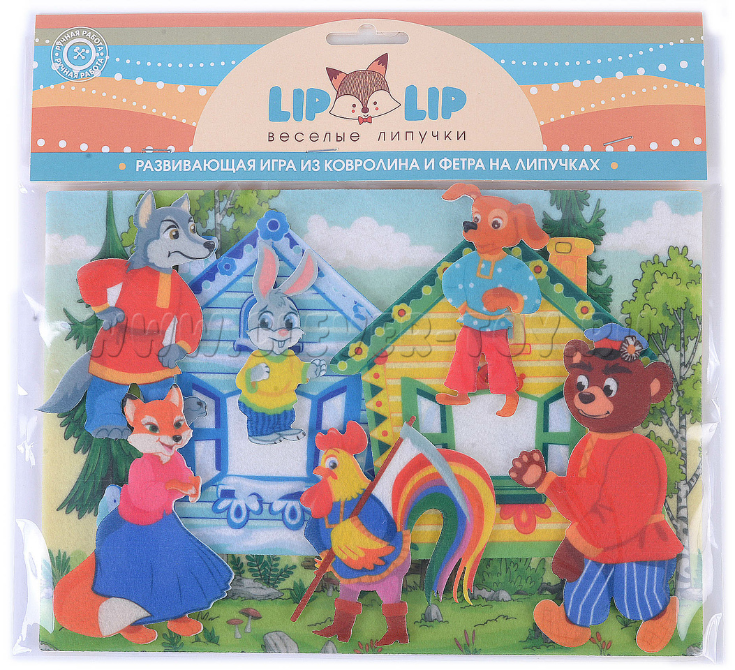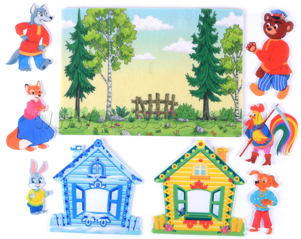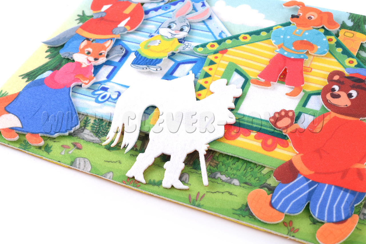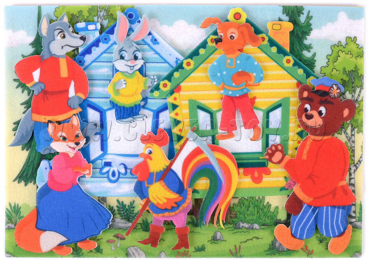 • Фигурки персонажей: зайца, лисы, петуха, волка, пса и медведя (6 шт.);