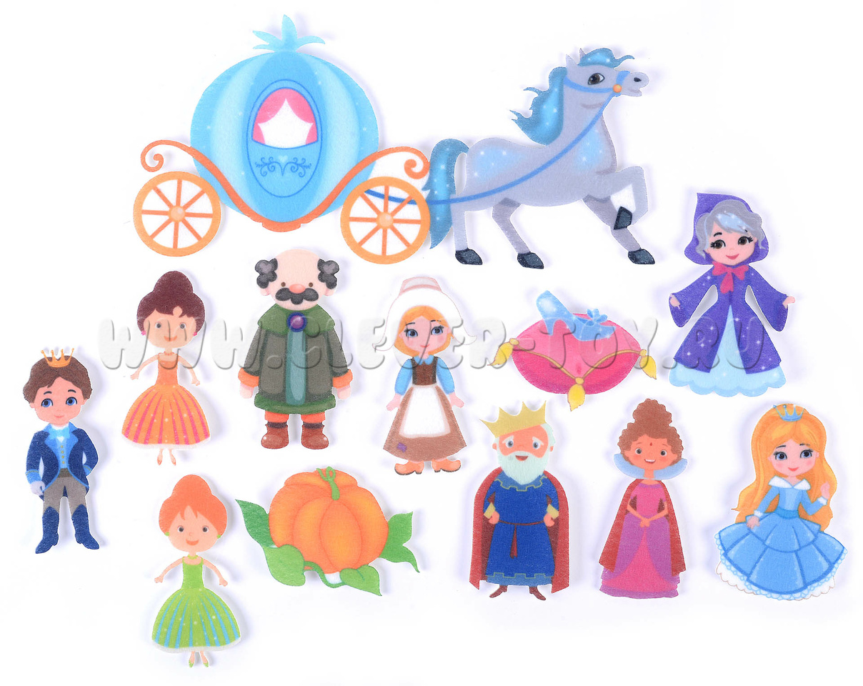 - Фигурки персонажей: Золушка в повседневном и бальном платьях, ее отец, мачеха, сводные сестры, крестная фея, принц, король, тыква, карета, запряженная лошадью и хрустальная туфелька (12 шт.).