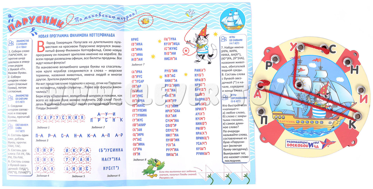 Описание игры: звездочка - является символом заменителем любой буквы; кнопка - шнурок может продеваться в кнопку, огибать ее или закручиваться вокруг нее; начало слова парусник - на рисунке показан пример написания слова шнурком; узелок - обозначает начало слова.