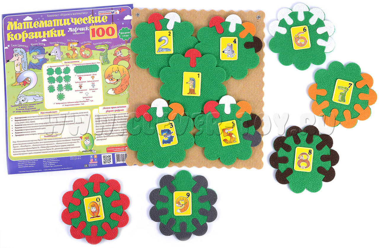 По сравнению с пособием «Математические корзинки 10» данное игровое пособие содержит увеличенное количество корзинок «дцать» и позволяет осваивать числа в пределах сотни.
