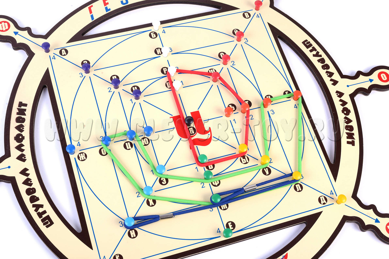 При помощи координатной сетки, гвоздиков с «именами» и разноцветных резинок ребёнок научится создавать фигуры по схемам и координатам, придумывать свои фигуры, трансформировать геометрические фигуры, шифровать их, находить отражение фигур в зеркале и т.д.