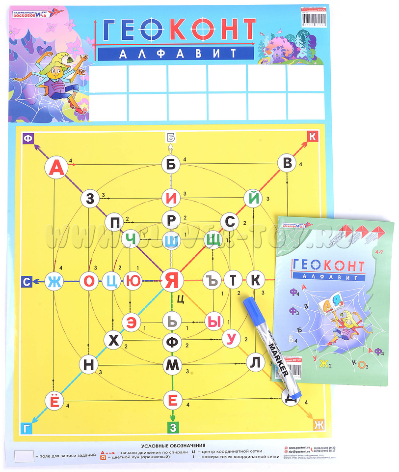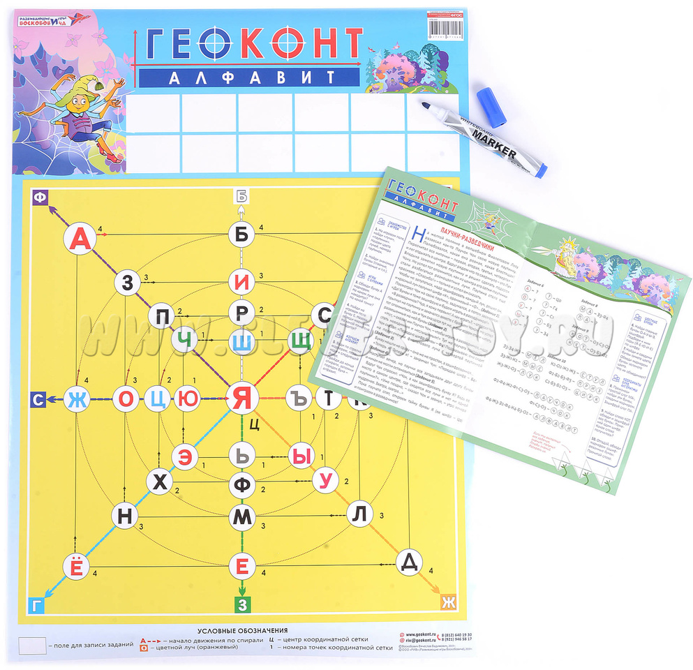 Задания выполняются при помощи маркера, входящего в игровой комплект. Покрытый специальной плёнкой плакат позволяет многократно использовать игровое поле – следы маркера легко удаляются обычной салфеткой.