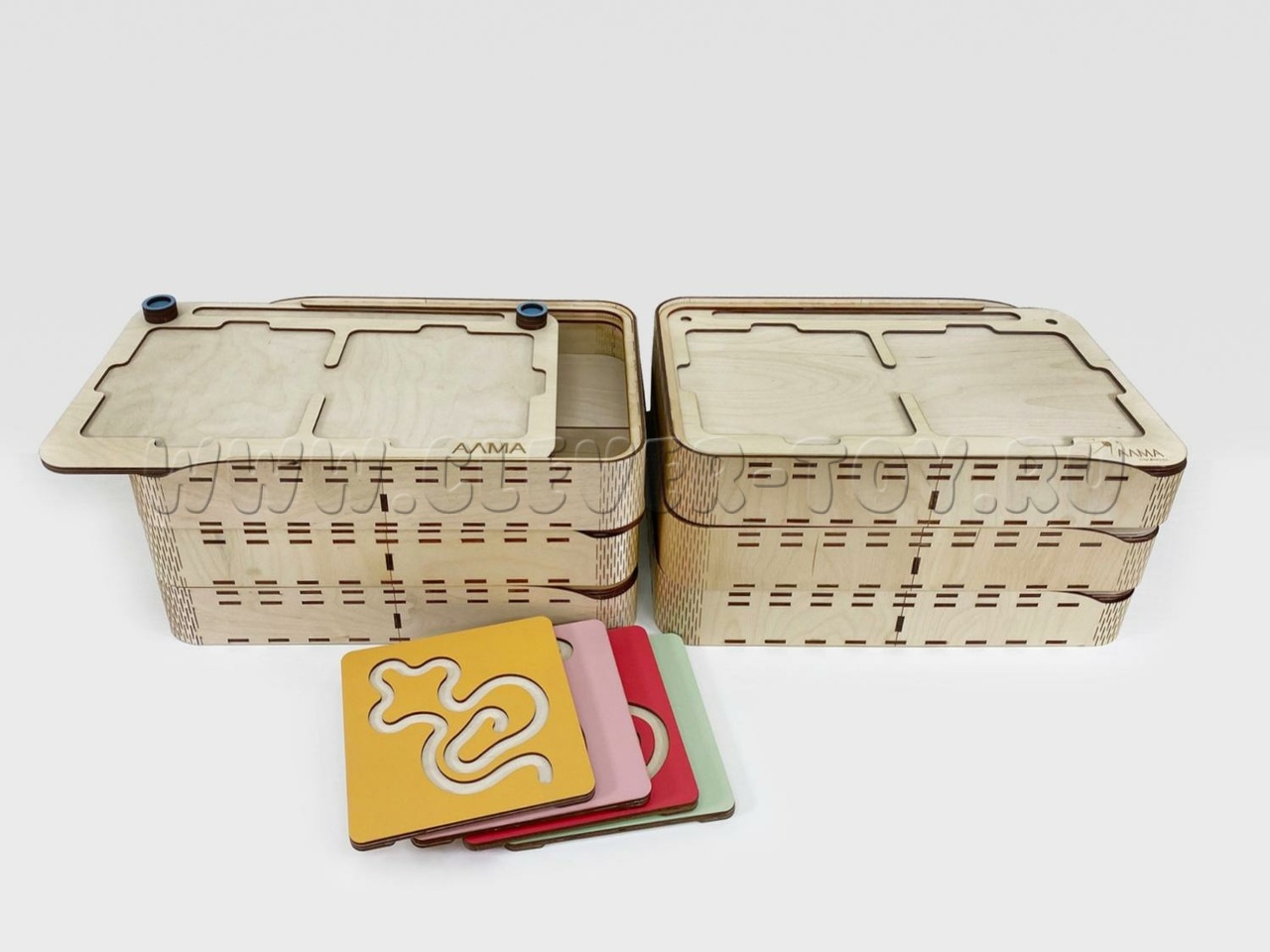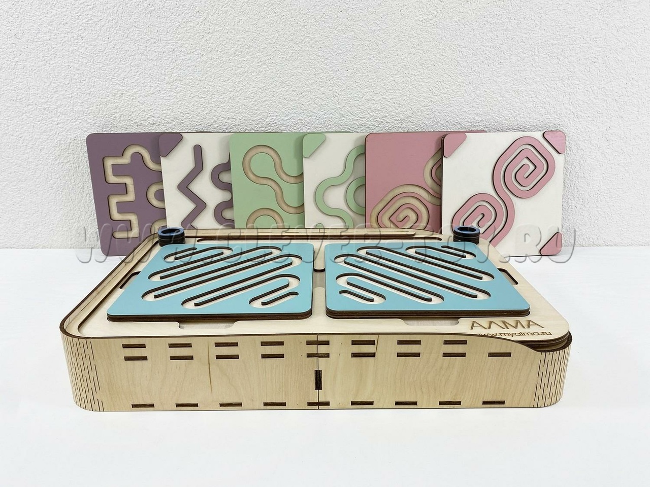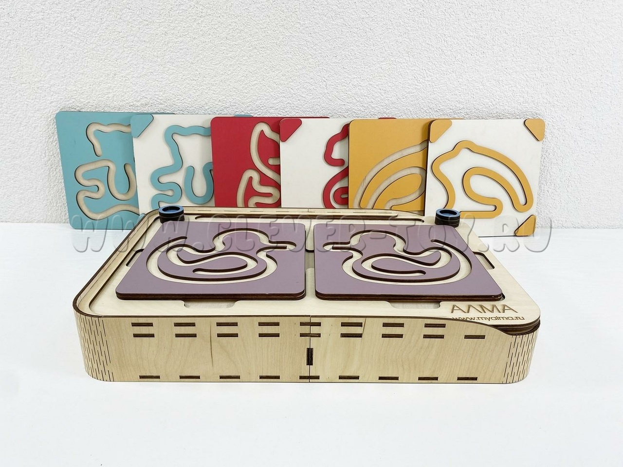 Состоит из основания в виде коробки и разноцветных лабиринтов-вкладышей.