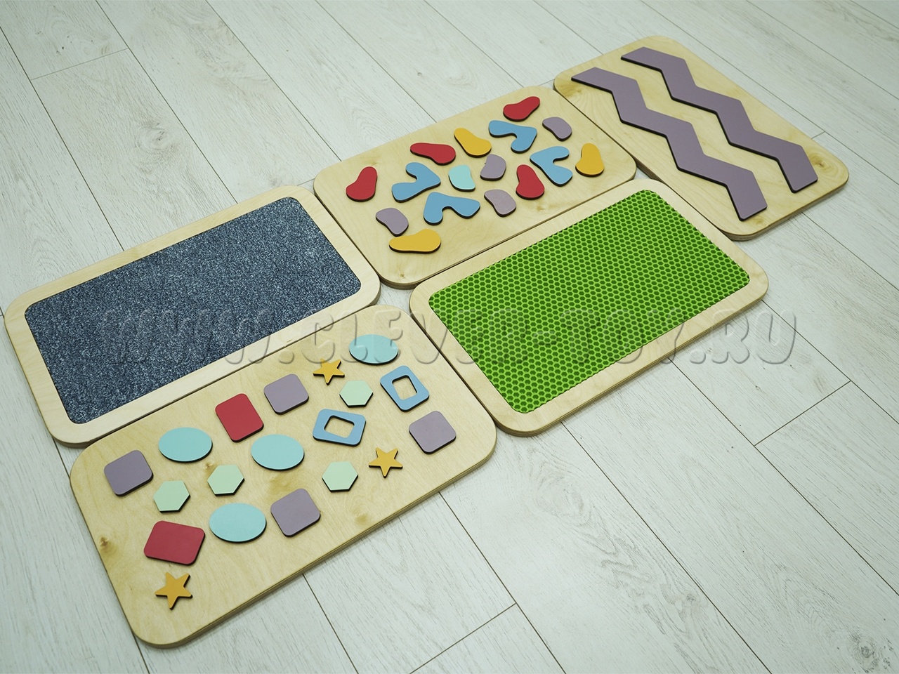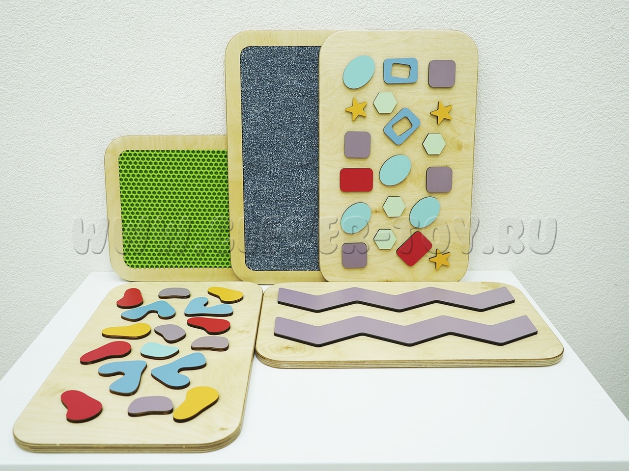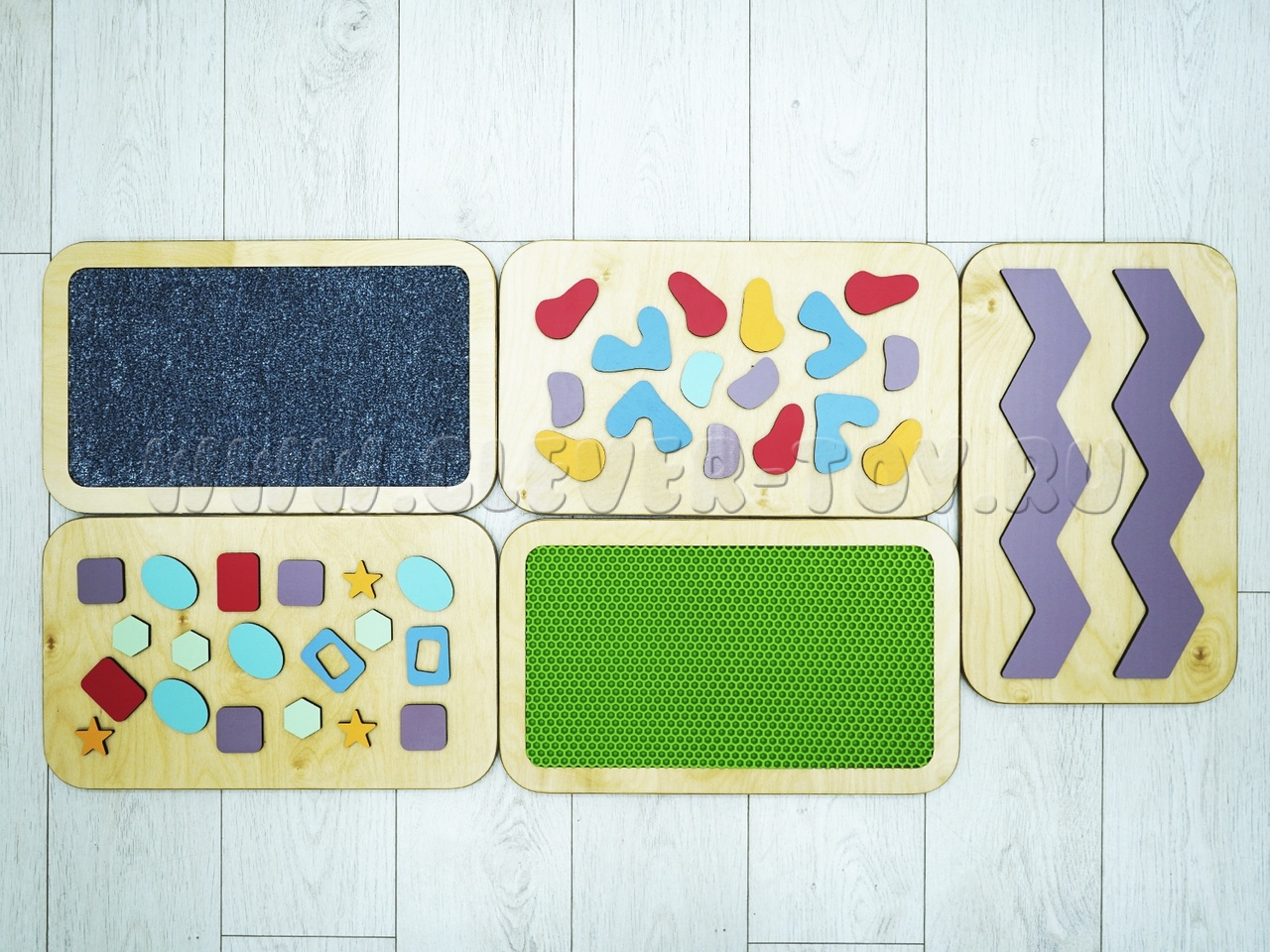 Набор состоит из пяти панелей с тактильными поверхностями разного типа: