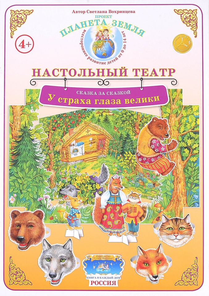 Настольный театр "У страха глаза велики" представляет собой объемных персонажей в декорациях. Ребенок сможет сам построить сказку по своим мотивам, а так же сыграть по плану который идёт на обороте настольного театра.