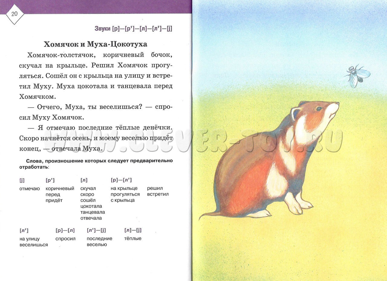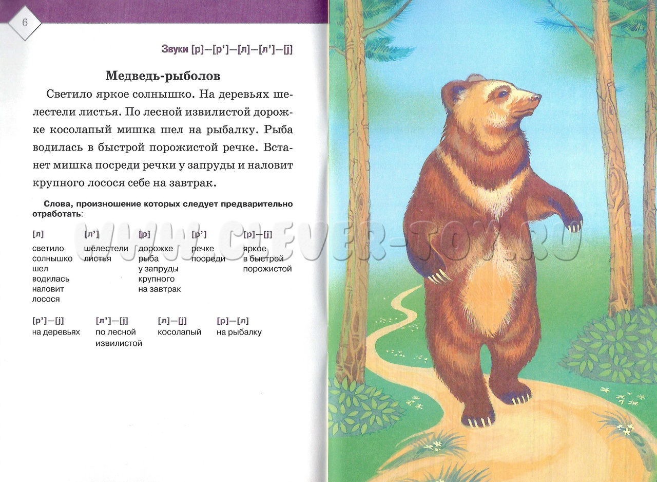 На каждом развороте представлен небольшой текст, наполненный словами с необходимыми звуками. Ниже него выделены эти слова, которые следует предварительно отработать. На другой странице представлена яркая картинка, подкрепляющая рассказ.
