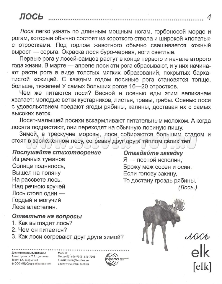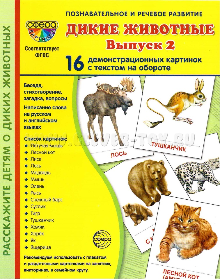 На обороте каждой предметной картинки - описание животного, стихотворение, загадка, вопросы для ребёнка, название животного на русском и английском языках. Комплект подходит для индивидуальной и групповой работы, с детьми 3-7 лет.