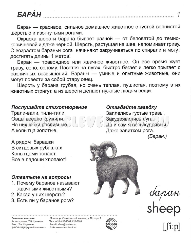 Состав комплекта (16 карточек): Баран, лошадь, жеребёнок, коза, козлёнок, осёл, корова, телёнок, кошка, котёнок, кролик, свинья, поросёнок, собака, щенок, овца с ягненком.