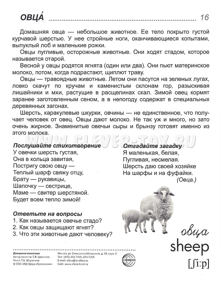 16 демонстрационных картинок размером 18*22 см для познавательного и речевого развития. На обороте каждой предметной картинки - описание, стихотворение, загадка, вопросы для ребёнка, название на русском и английском языках.