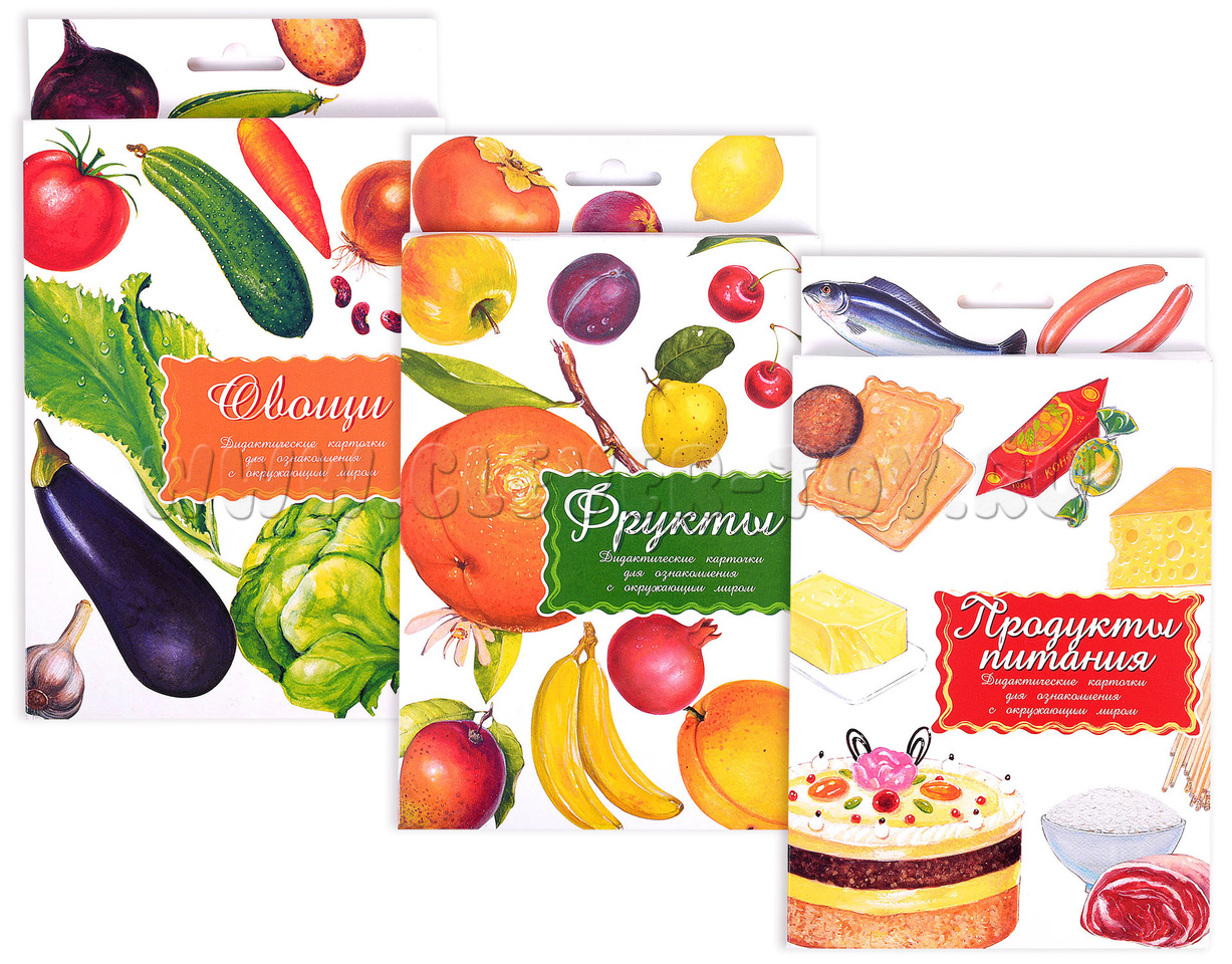 В набор входит: Дидактические карточки "Овощи" Дидактические карточки "Фрукты" Дидактические карточки "Продукты питания"