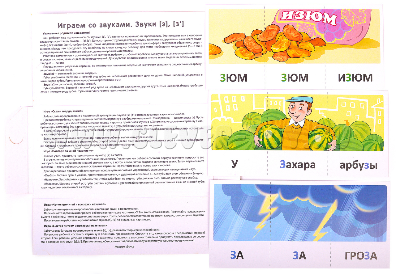 Это издание предназначено для обучения детей чтению в возрасте от 4 до 7 лет и включает в себя 12 обучающих картинок, состоящих из 36 карточек и 4 увлекательных игр. Оно является продолжением тематического комплекта "Играем со звуками. Звуки [с], [с']".
