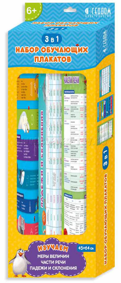 Комплектация: обучающий плакат "Меры величин" (45*64 см), обучающий плакат "Части речи" (45*64 см), обучающий плакат "Падежи и склонения" (45*64 см).