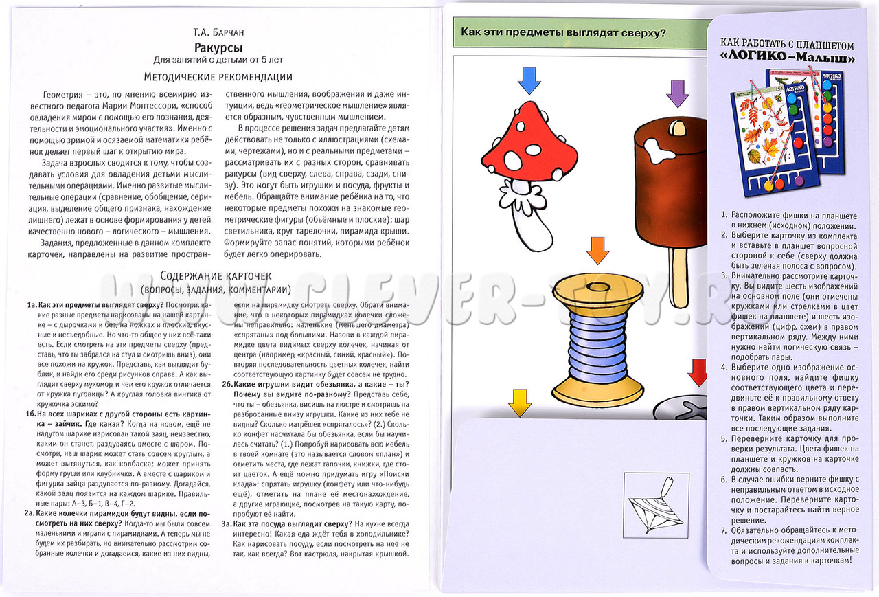 Задания комплекта направлены на развитие пространственного мышления, воображения и даже интуиции, ведь «геометрическое мышление» является образным, чувственным мышлением. Ребёнок научится угадывать, как будут выглядеть предметы с разных сторон, обратит внимание на то, что некоторые объёмные предметы сверху или сбоку похожи на плоские геометрические фигуры. Примеры заданий в карточках: 1а. Как эти предметы выглядят сверху? 2б. Какие игрушки видит обезьянка, а какие – ты? Почему вы видите по-разному? 4а. Как каждая шляпа клоуна выглядит сверху? 5б. Найди в этих узорах следы от колёс каждого транспортного средства. 7б. Какие машины гном увидел с воздушного шара?