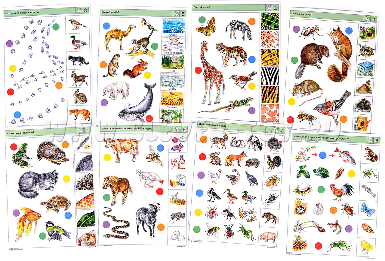 Основное назначение комплекта – ознакомление ребёнка с разнообразным миром животных. В процессе решения заданий, ребенок будет не только узнавать и называть новых и хорошо ему известных представителей животного мира, но и подбирать для них жилища, «одежду», питание, среду обитания, следы. Кроме того он будет определять к какой группе относятся те или иные представители животных (млекопитающие или звери, птицы, насекомые, рыбы, пресмыкающиеся и др.), опираясь в своем выборе на общие признаки отдельных видов. Другие темы карточек: пары взрослых животных и их детенышей; этапы развития; способы передвижения; взаимодействие с человеком. Задания по теме равномерно распределены на два комплекта карточек Животные (1) и Животные (2) и не повторяются. Примеры заданий в карточках: 1б. Чем покрыто тело этих животных? У кого перья, шерсть, иголки, чешуя, кожа, панцирь? 3а. Кто оставил следы на снегу? 4а. Где чьё жилище? 6а. Какой этап в развитии животных пропущен? 7б. Где домашние, а где дикие животные (птицы)?