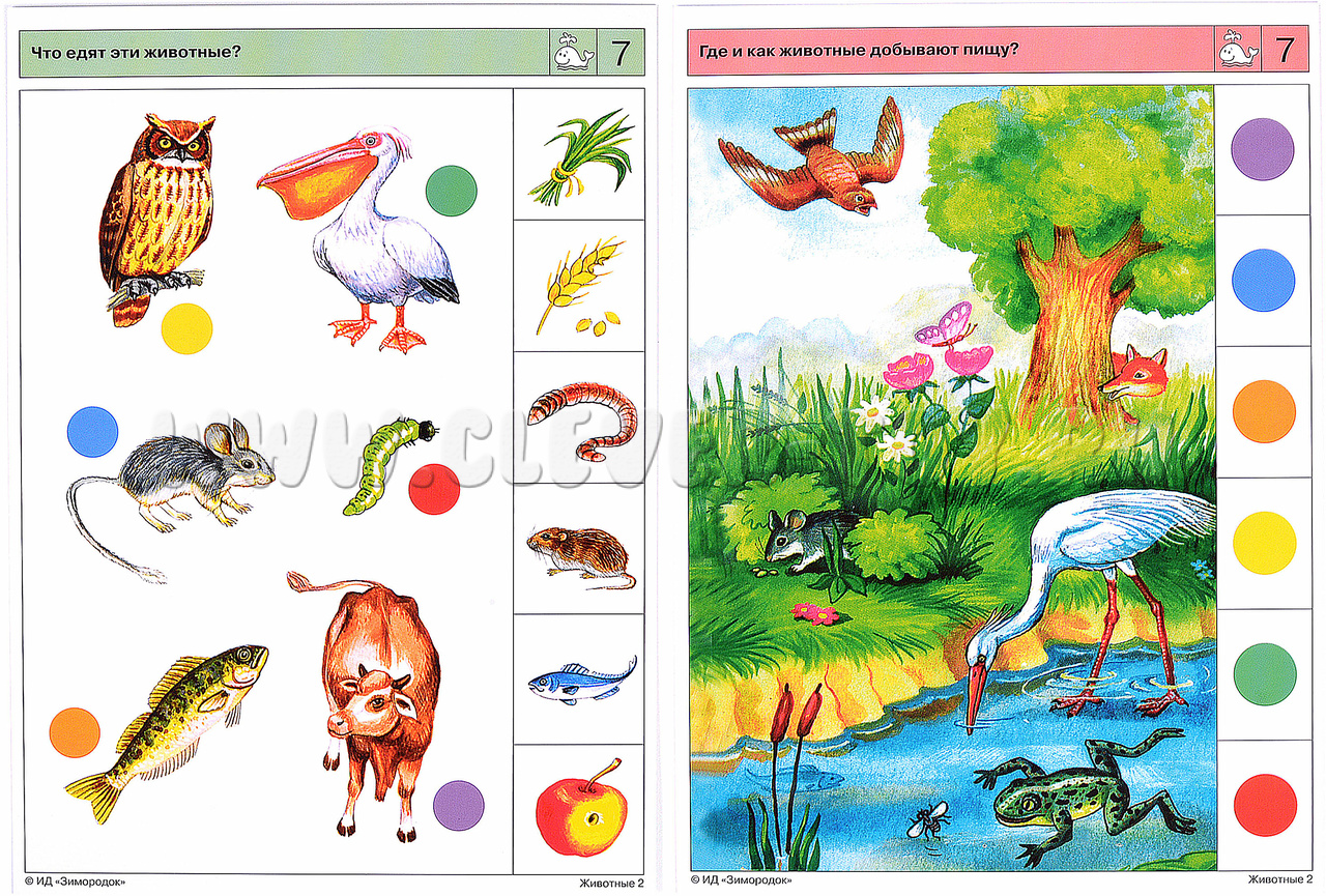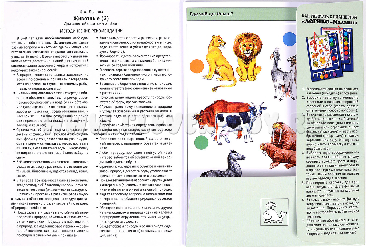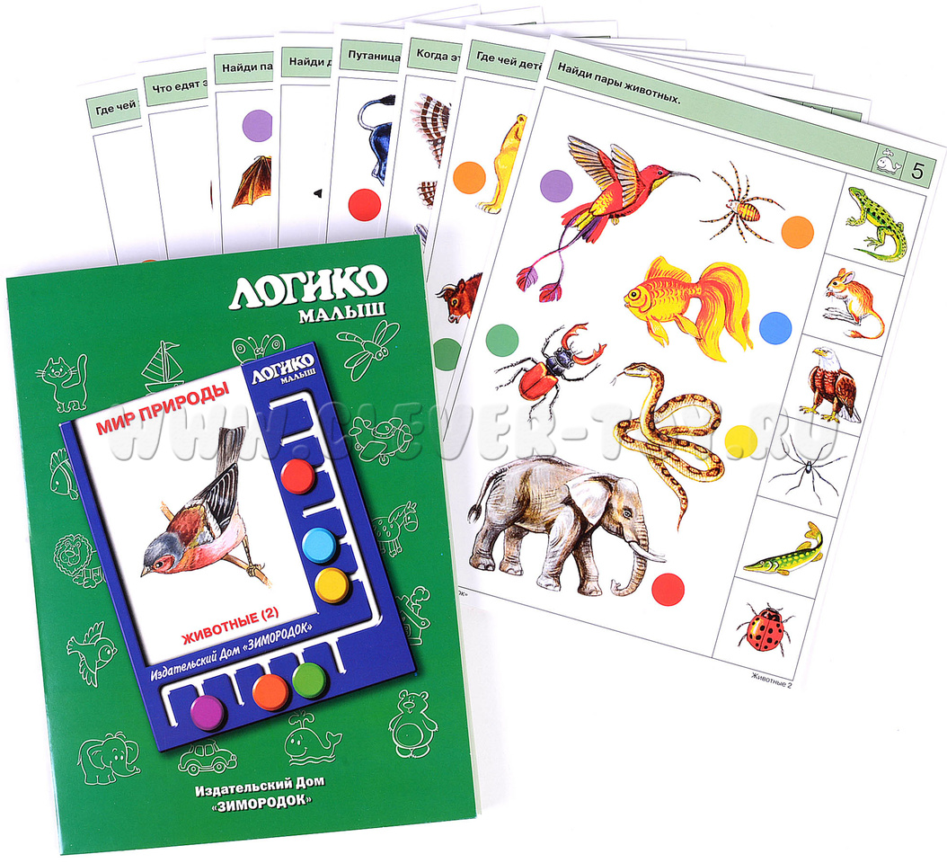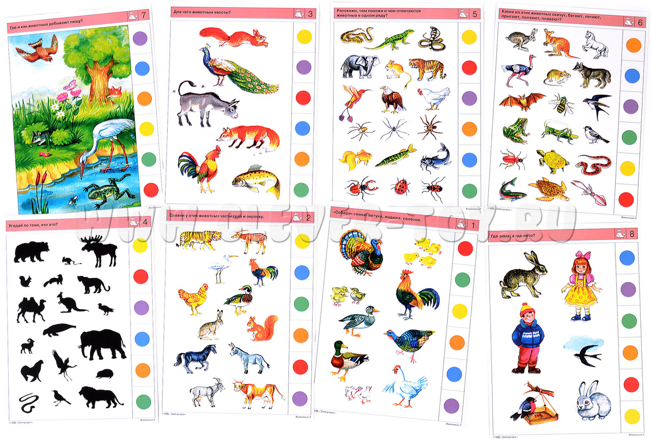 Основное назначение комплекта – ознакомление ребёнка с разнообразным миром животных. В процессе решения заданий, ребенок будет не только узнавать и называть новых и хорошо ему известных представителей животного мира, но и подбирать для них жилища, «одежду», питание, среду обитания, следы. Кроме того он будет определять к какой группе относятся те или иные представители животных (млекопитающие или звери, птицы, насекомые, рыбы, пресмыкающиеся и др.), опираясь в своем выборе на общие признаки отдельных видов. Другие темы карточек: пары взрослые животные и их детеныши; этапы развития; способы передвижения; взаимодействие с человеком. Задания по теме равномерно распределены на два комплекта карточек Животные (1) и Животные (2), и не повторяются. Примеры заданий в карточках: 1а. Где чей детёныш? 2б. Сравни у этих животных части тела и окраску. 3а. Где чей хвост? 6б. Какие из этих животных скачут, бегают, летают, прыгают, ползают, плавают? 7б. Где и как животные добывают пищу?