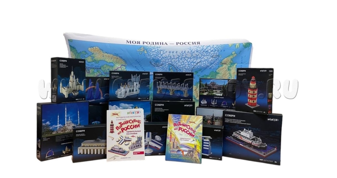 Набор направлен на знакомство с удивительными архитектурными сооружениями России. Коллекция включает знаковые объекты различных периодов постройки. Авторские акварельные иллюстрации, географическая карта России и конструктор составляют тематическое единство и создают условия для целостного восприятия культурного достояния страны.