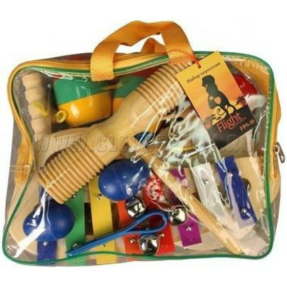 Перкуссионный набор FLIGHT FPS-10 состоит из 10-ти предметов, оформленных в красочном стиле: разноцветного металлофона с палочкой, круглого тамбурина с натуральной мембраной, пары разноцветных маракас, пары пластиковых кастаньет, пары шейкеров в форме "яиц", цимбал, гуиро, тон-блока, металлического треугольника с палочкой и джингл-стика.