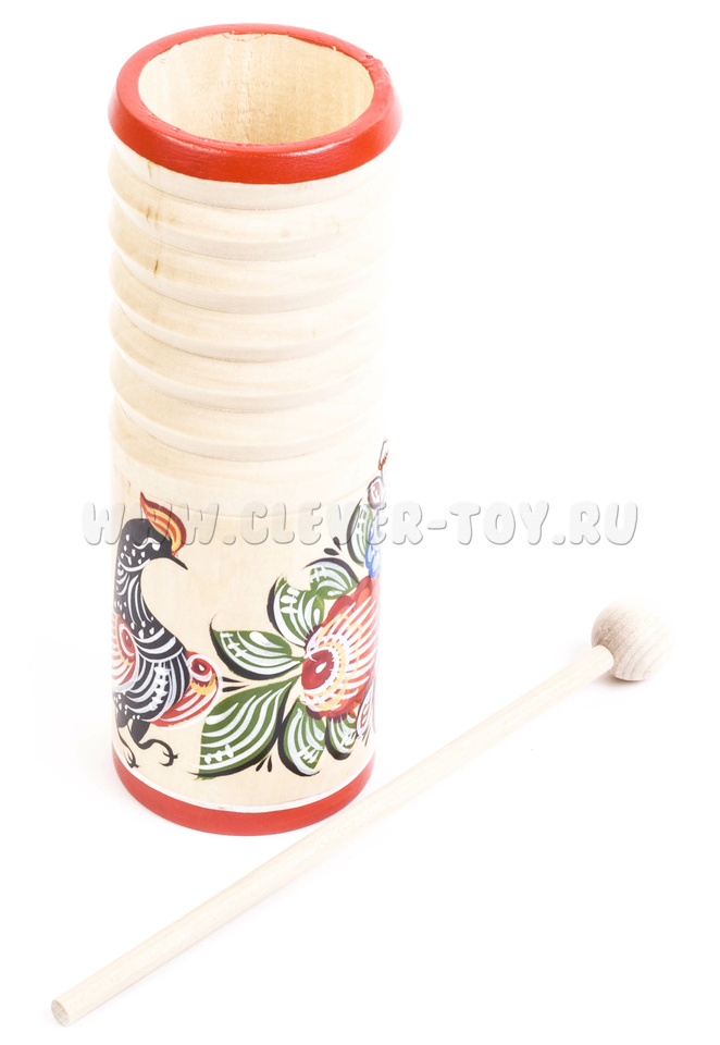 Погремушка представляет собой деревянный цилиндр диаметром 50 мм и высотой 120 мм. Внутри находится полый стакан с охотничьей дробью. Цилиндр с внутренней стороны гладкий, снаружи - ребристый. Канавки под углом 90 градусов выполнены токарным способом. Музыкальный инструмент комплектуется ударной палочкой с шариком на конце. Материал: липа.