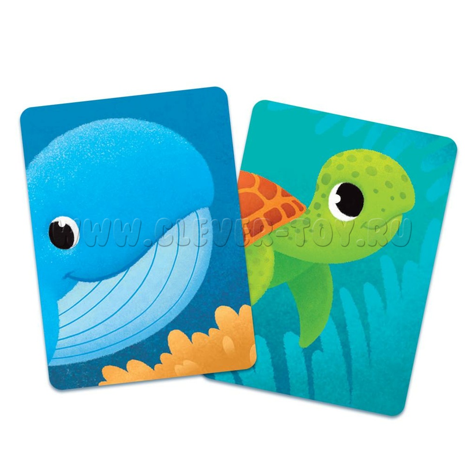 • 30 карточек с изображением представителей водной стихии, всего в колоде 15 пар карточек, каждая из которых должна составить целое морское животное;