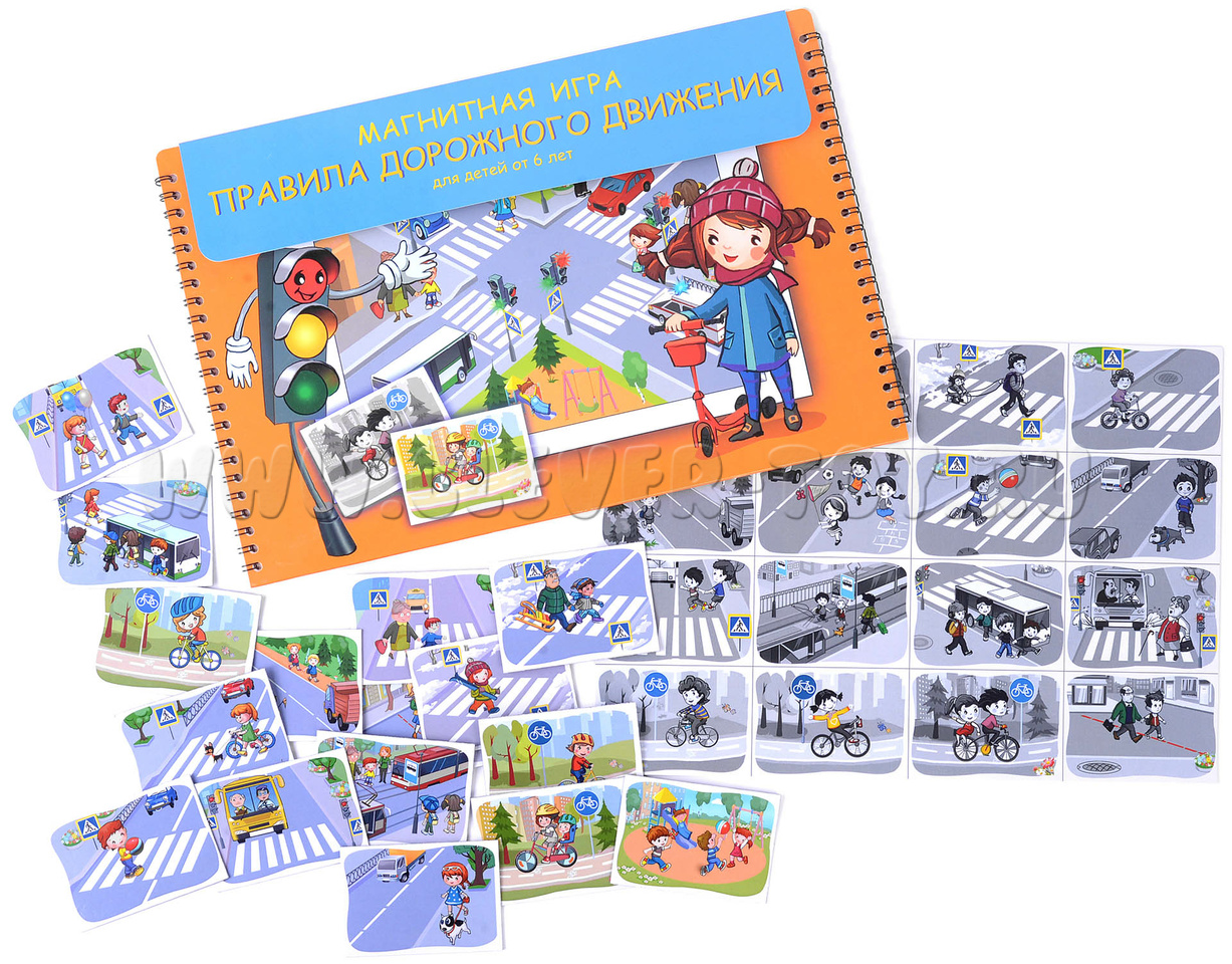 Как играть? Возьмите черно-белое магнитное поле, оно разделено на прямоугольники. В каждом из них - та или иная дорожная ситуация. Рассмотрите их, найдите участников дорожного движения, которые нарушают правила.