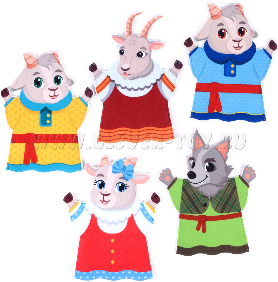 В наборе 5 фигурок: коза, козленок (2 шт.), козочка, волк. Средний размер фигурки 195*240 мм.