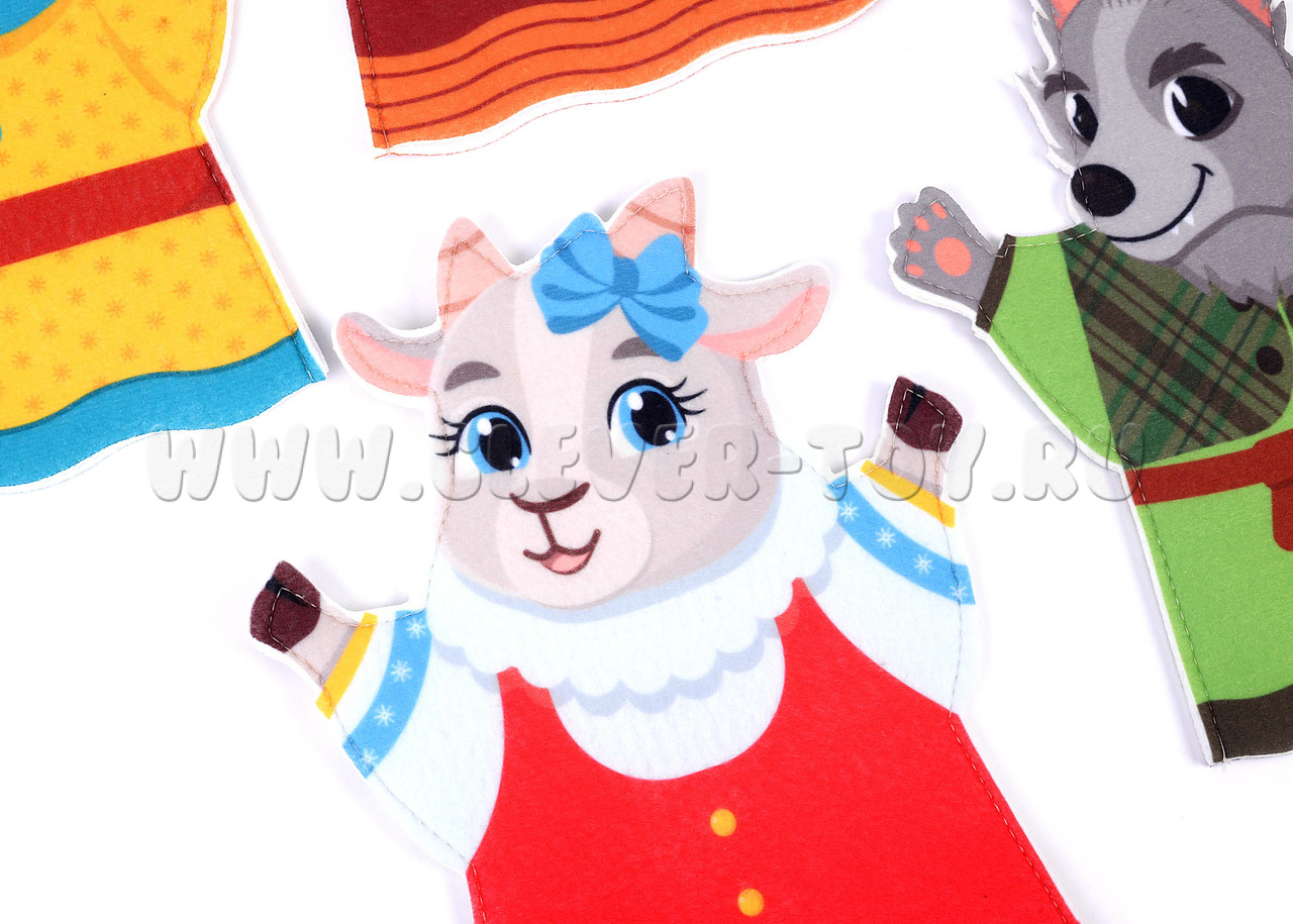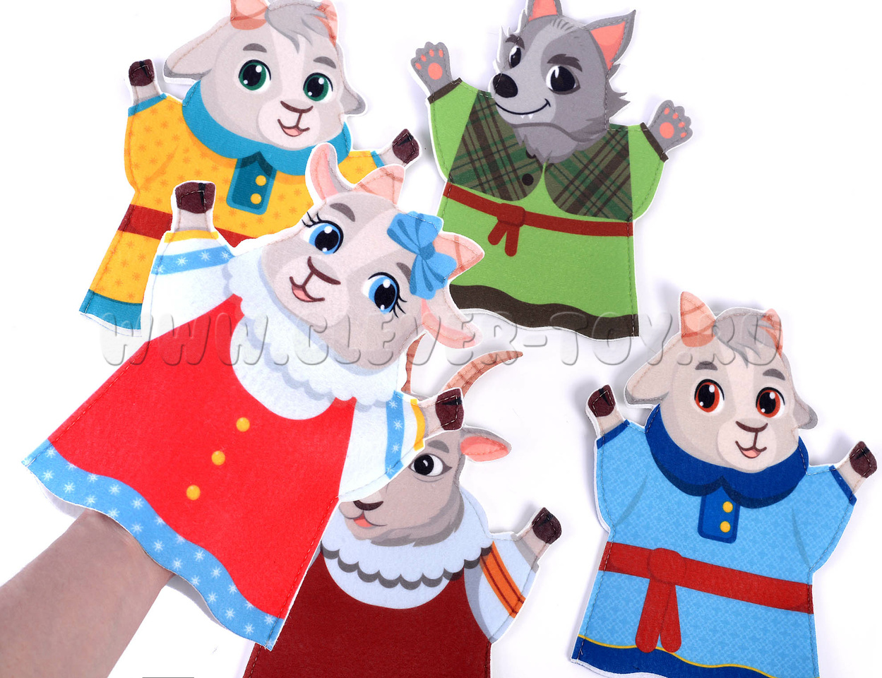 Театр на руку "Волк и козлята" – это долговечный сюжетный набор для разыгрывания постановок семейного театра и организации дидактических игр с детьми любого возраста. Занятия с театральными наборами способствуют развитию речи, творческого мышления, памяти и внимания, артистических способностей.