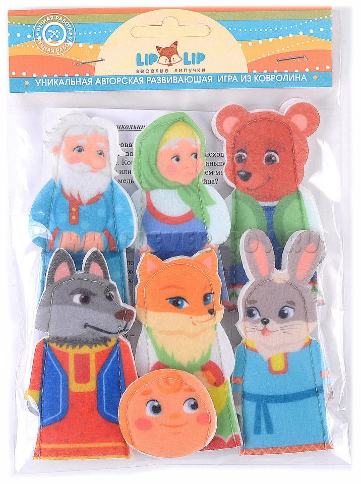 Набор пальчикового театра состоит из: 7 фигурок (размер: 9 см) с изображением сказочных персонажей сказки Колобок (Старик со старухой, Колобок, Заяц, Волк, Лиса ) и инструкция с описанием игр.