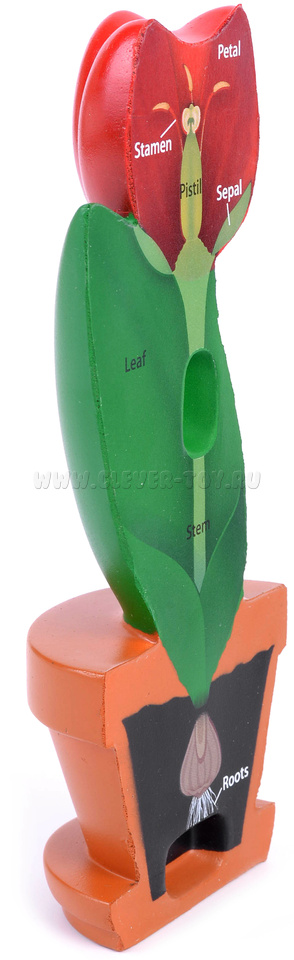 Реалистично подробная пластиковая модель цветка разделяется на половинки: на одной - названия частей цветка (на английском языке), на другой - только буквенное обозначение, для самостоятельной проверки.